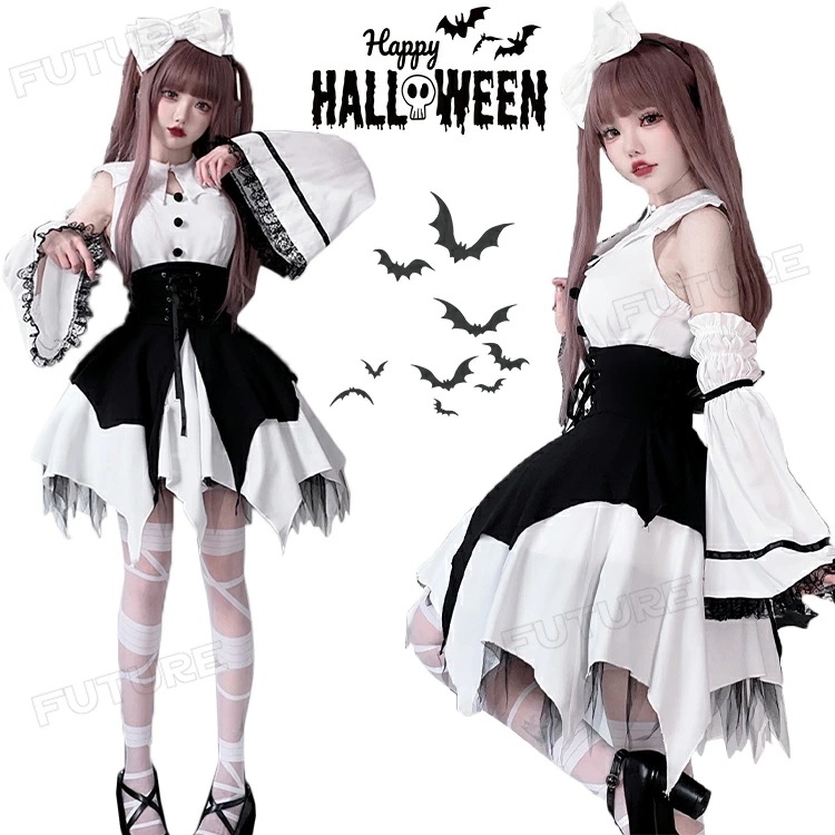 ハロウィン 仮装 大人 女性 魔女 コスプレ ワンピース 可愛い メイド 服 女性用 5点セット 黒 ホワイト ブラック 修道女 聖女 修道服 悪魔 ロリィタ メイド ヘアバンド リボン コスチュームコスプレ・変装・仮装