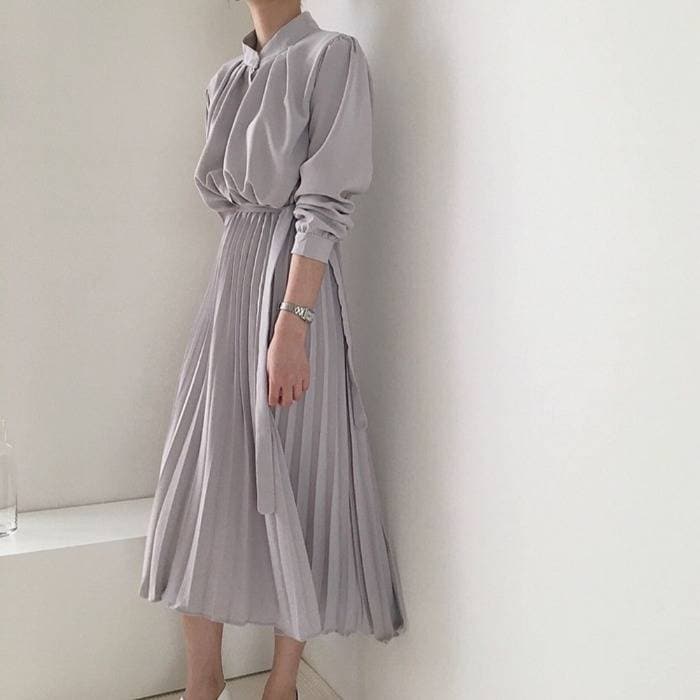 グレー ワイドパンツ プリーツ入り