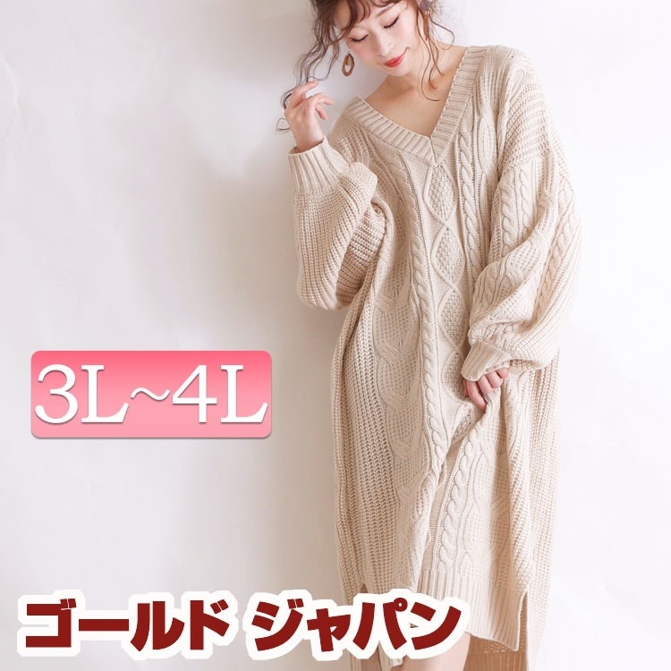 ケーブル編みニットワンピース 大きいサイズ レディース ワンピース ワンピ ニットワンピース ニットワンピ バルーンワンピース ニット スリット バルーン 長袖 Vネック ケーブル編み ミディアム 膝