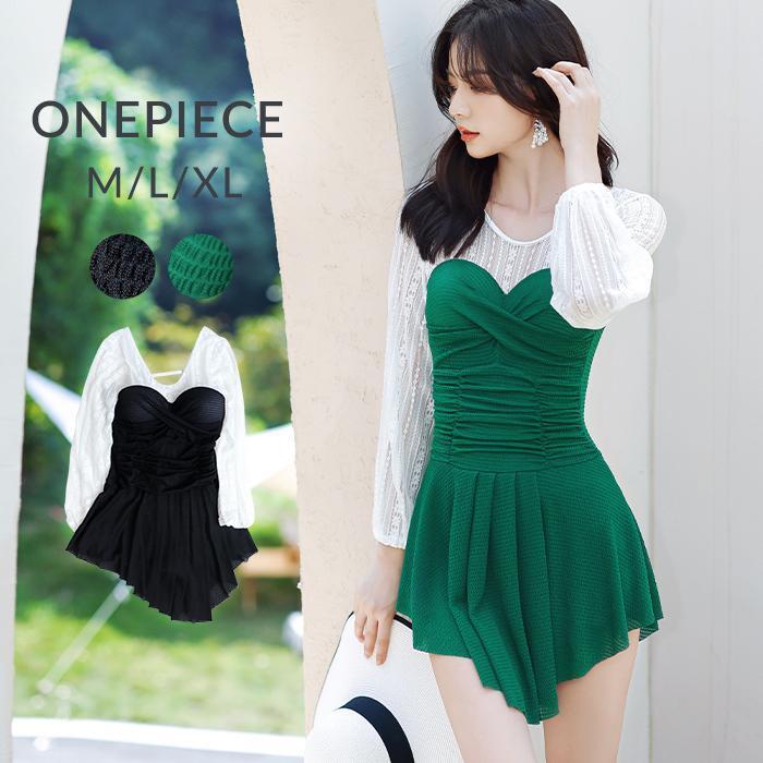高級タイプの水着 水着 夏レディース ワンピース 春 体型カバー レーススリーブ 長袖 アシンメトリーワンピース 春水着 夏 おしゃれ グリーン ブラック