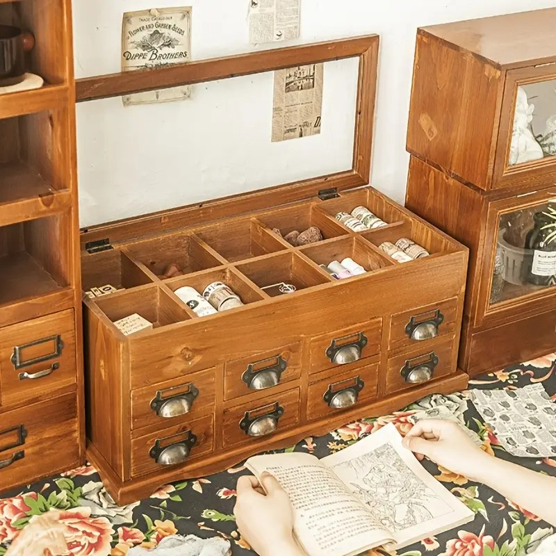 収納ボックス ヴィンテージ調 木製 引き出し付き 多層ガラス製 手芸用品 小物入れ 卓上 デスクワーク アトリエ インテリア ナチュラル シンプル お洒落 デスクトップ 針糸 収納家具 4-7
