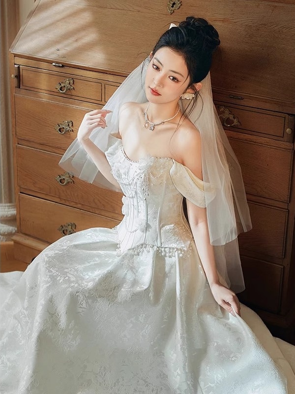 トーストドレス花嫁登録証明書ワンショルダーの婚約披露宴イブニングドレス女性用モーニングガウン