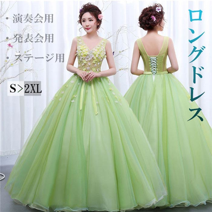 【5サイズ】カラードレス ロングドレス 演奏会 ピアノ 発表会 ロング 大人 ステージ 衣装 大きいサイズ Vネック ノースリーブ グリーン 舞台 コンサート エブリ da013t2t2l7/代引不可ドレス