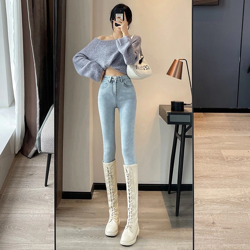 小さい足ジーンズ着痩せ新型ハイウエストジーンズ弾力ジーンズ レトロ タイトパンツ鉛筆ズボンスキニーデニムパンツQNZK32