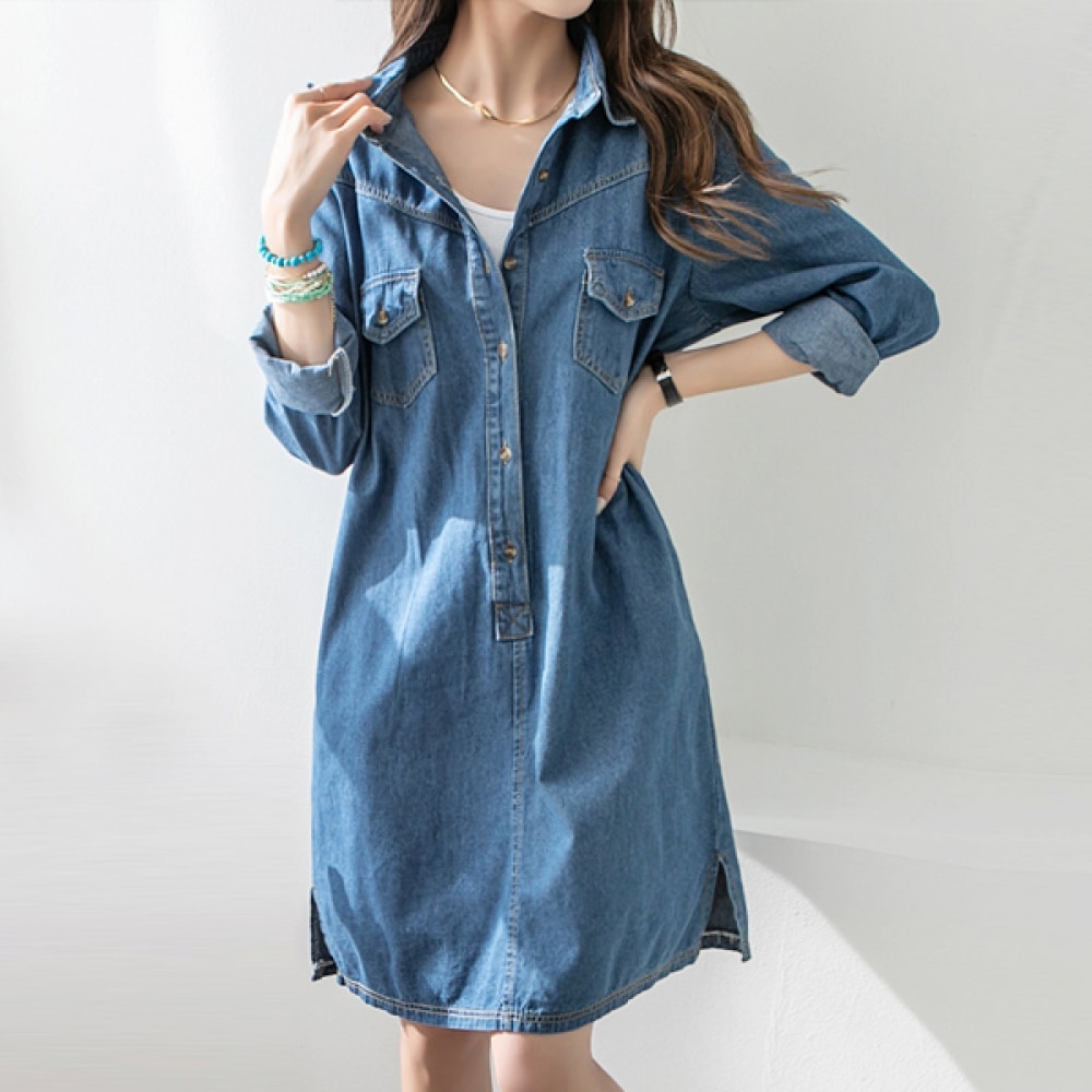 韓版 ゆったり ブルーシャツ やさしい 開襟 長袖TシャツワンピースXFZ39