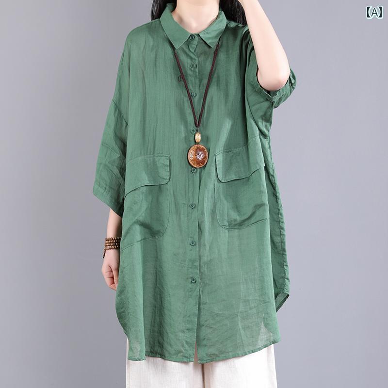 レディース シャツ トップス リネンシャツ レディース ハイエンドの 夏の 薄手 綿 リネンの 無地の ミドル丈の 大きいサイズ シャツ ミッド スリーブシャツ・ブラウス