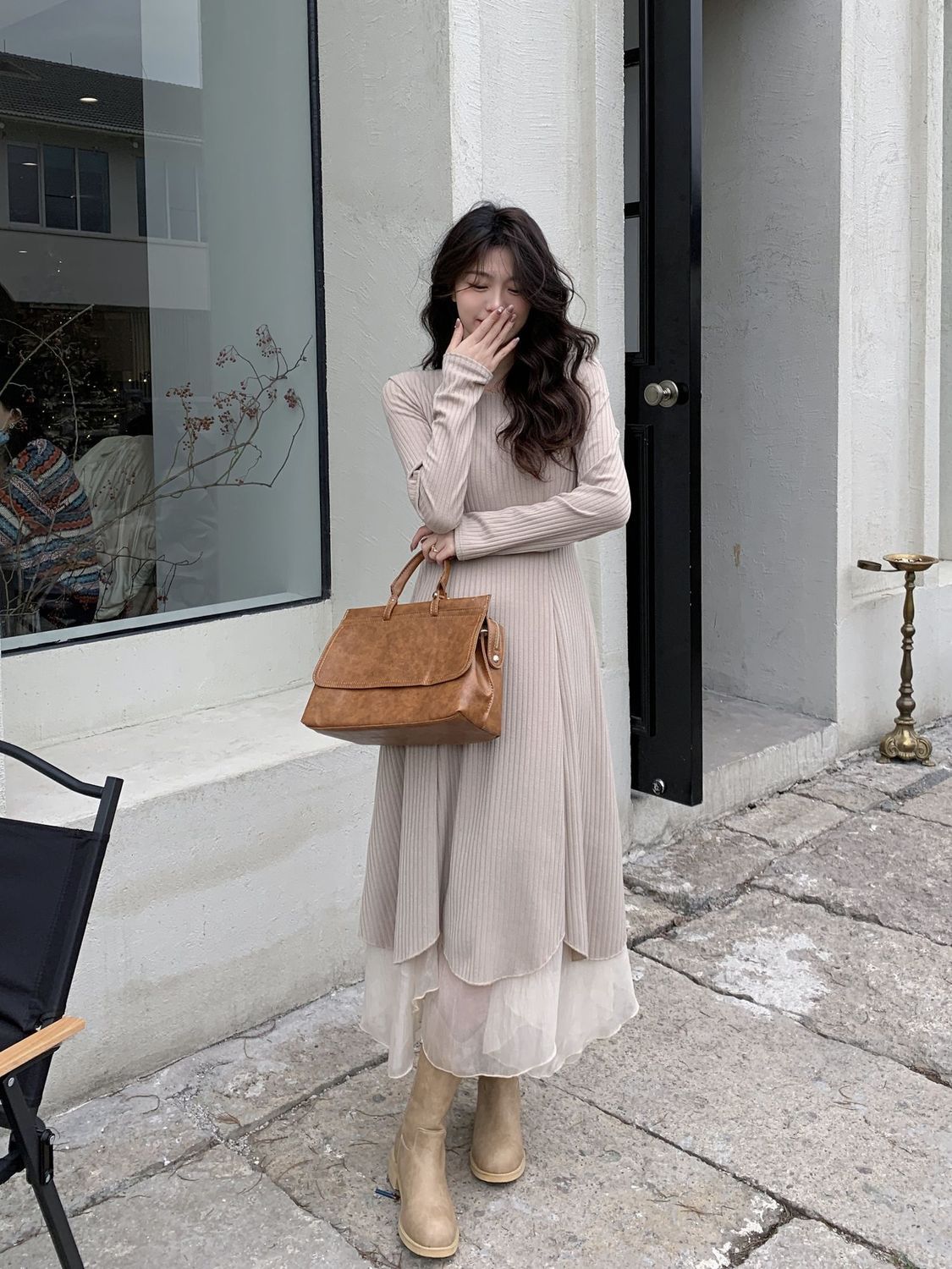 韓国ファッション春秋大きいサイズニットワンピースイレギュラーメッシュワンピース長袖ロングワンピース