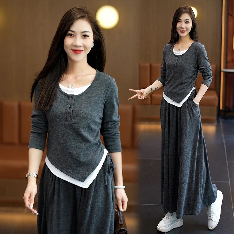 【Noir Mode】ワンピース 長袖ワンピース 秋冬 新作 韓国版 大きいサイズ スプライシング 薄手 プリーツ ゆったり ロングワンピース 女性
