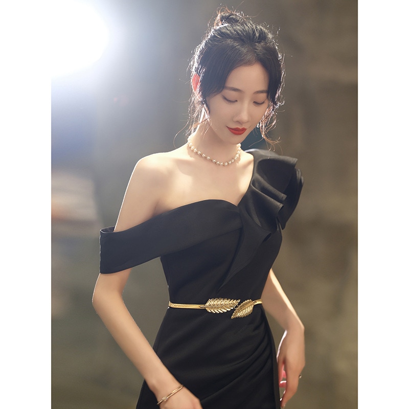 黒いドレスの女性シンで寛大でハイエンドの宴会の気質の感覚テイルスカートドレス