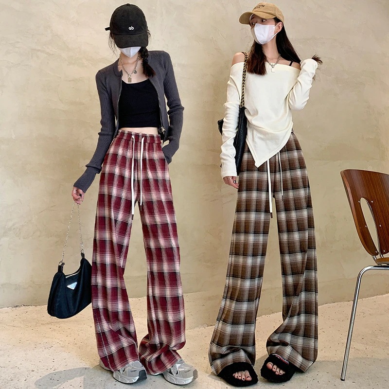 韓国大きいサイズ 赤レトロ格子ワイドパンツ秋冬ハイウエスト垂れ感ストレートスラックスパンツ