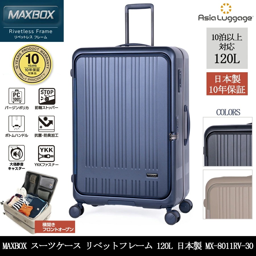 【日本製】【10年保証】 アジアラゲージ MAXBOX 120L リベットレスフレーム スーツケース MX-8011RV-30 フロントオープン 横開き 10泊以上 スーツケースカバー付き
