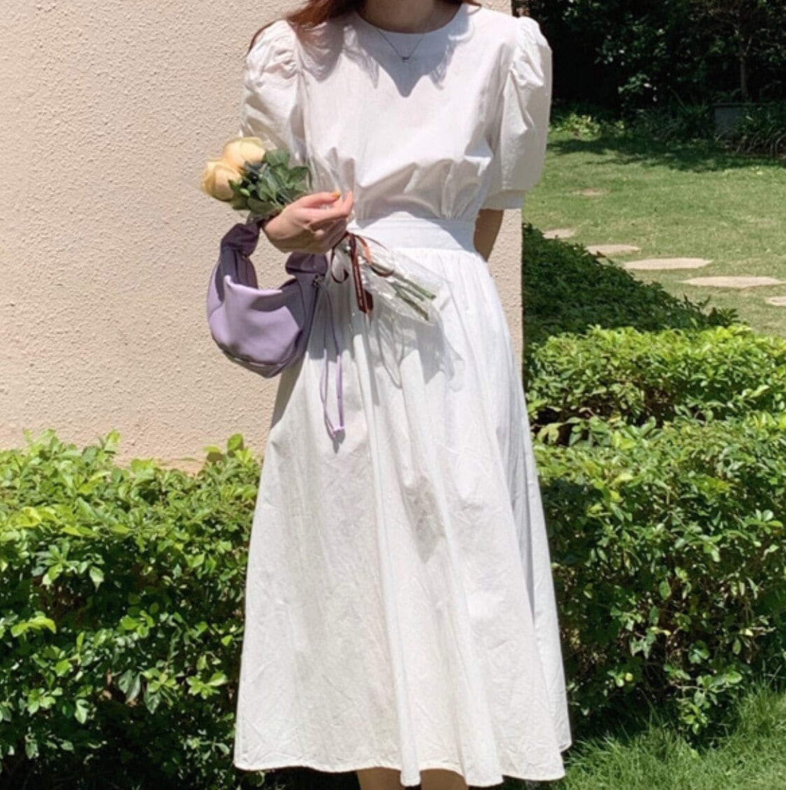 ¥5,040 ワンピース デート かわいい 大人可愛い きれいめ シンプル カジュアル 大人 上品 おしゃれ セットアップ 無地 パフスリーブ 半袖 フレア ロング丈 バックボタン ウエストゴム 韓国 イエロー