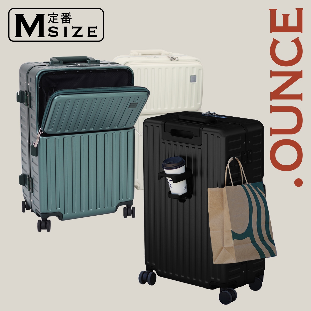 【3-4泊】 アジアラゲージ ドリンクホルダー付き スーツケース 37L/44L ジッパーキャリー 拡張機能 サスペンション内蔵キャスター 機内持ち込み可