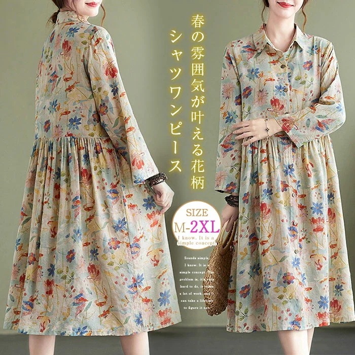 ワンピース ロング 綿 混 麻 レディース ロングワンピース ノーカラー Uネック バンドカラー 無地 長袖 ドルマン フレア Aライン フレアワンピース Aラインワンピース 体型カバー 大きいサイズ