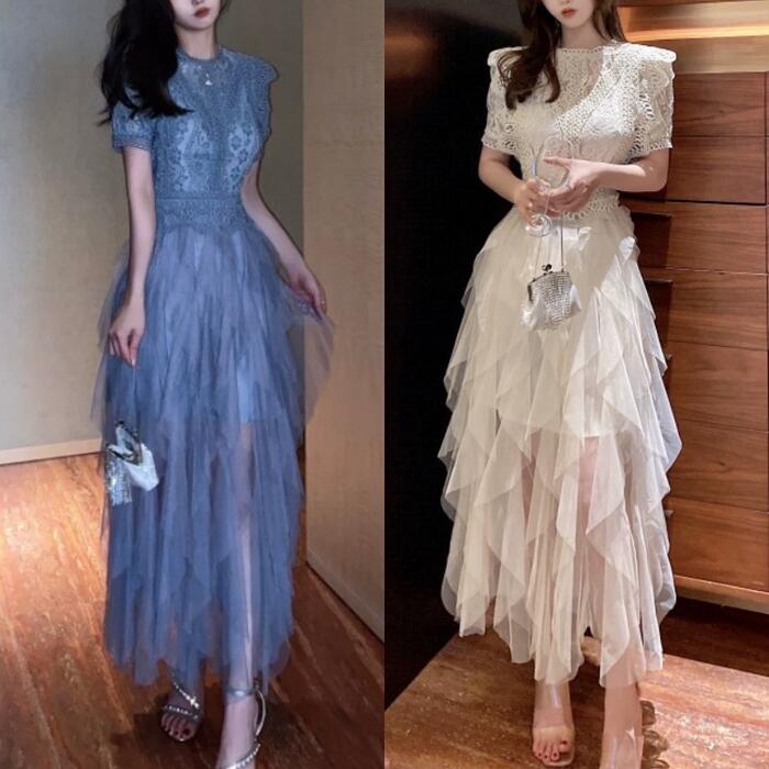 パーティー ワンピース 袖あり ロング丈 エレガント レース チュール レディース ワンピ ドレス フリル 半袖 きれいめ 二次会 セレモニー フェミニン お呼ばれ グレー ベージュ 春 秋 夏 20