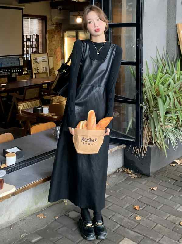 ジャンパースカート 大人 韓国 春秋 PUレザー ロング丈 スクエアネック ノースリーブ ワンピース Aライン ハイウエスト 通気 吸湿 ソフト レトロ カジュアル 黒
