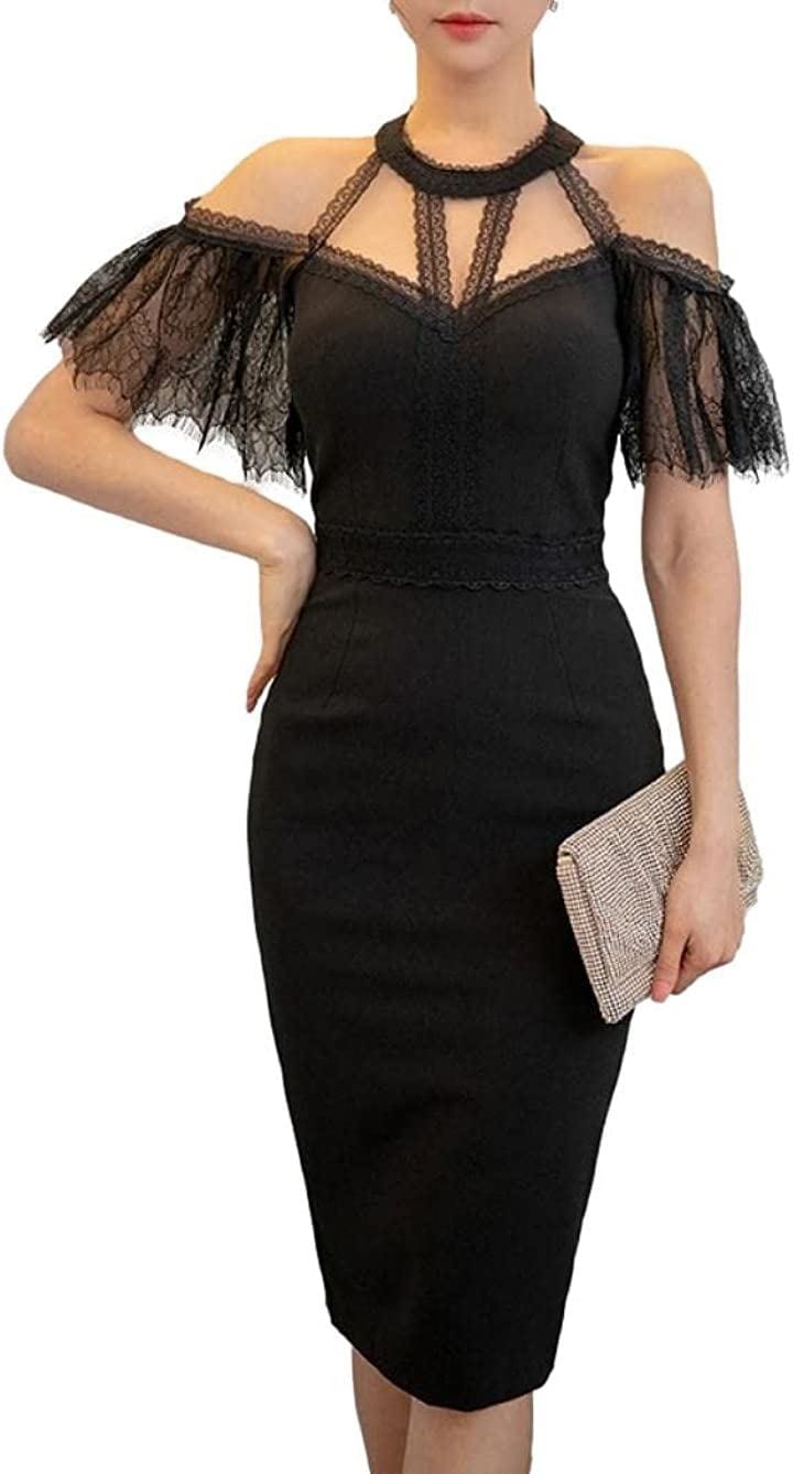 オフショルダー ワンピース リングネック タイト クラブドレス ひざ丈 レディース(ブラック, M)