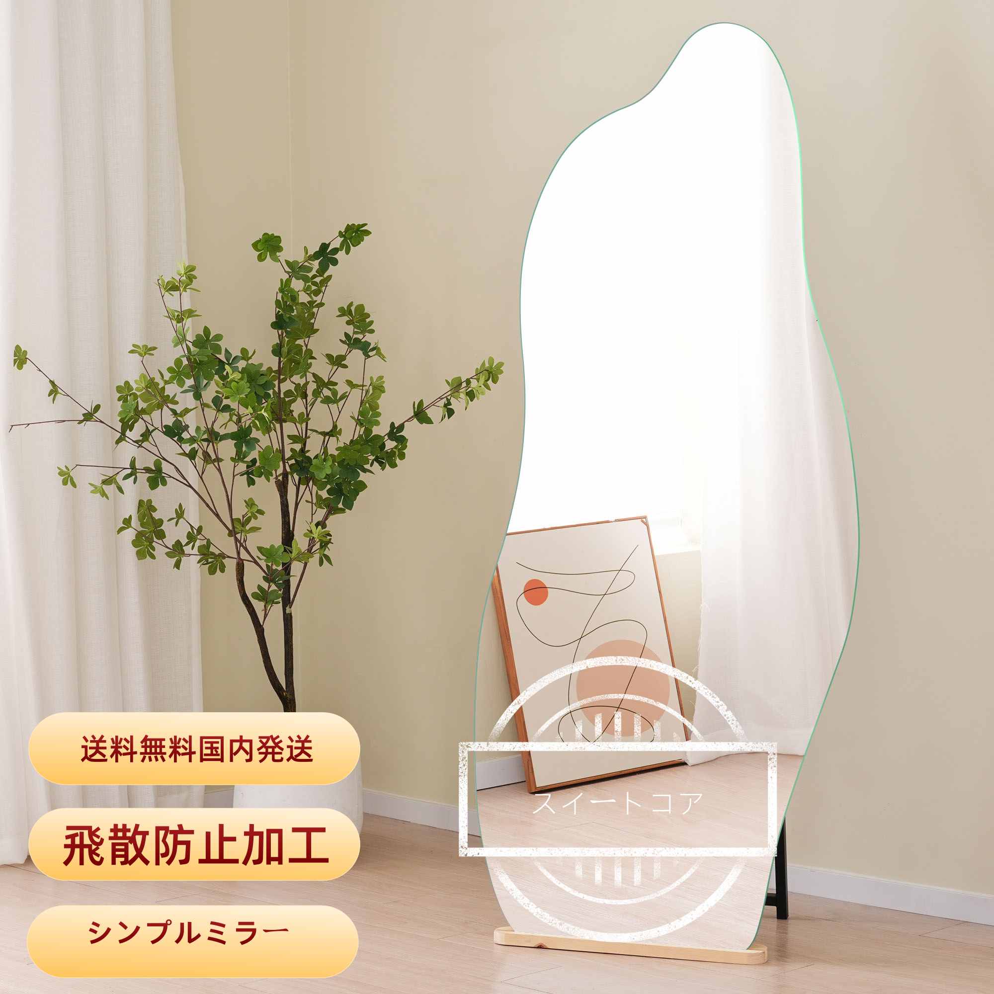 2030全身鏡 姿見鏡 スタンドミラー ノンフレーム イレギュラミラー 立てかけ 姿見 鏡 ミラー おしゃれ 大型 飛散防止 木製台あり 170*70CM